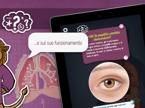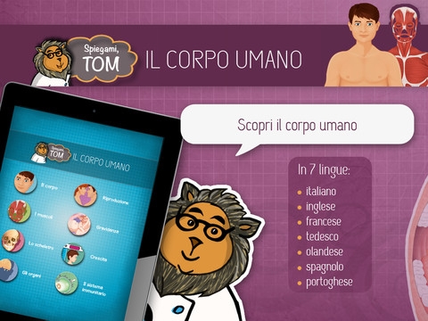 A questo ambisce l’applicazione “Tom, spiegami il corpo umano”, in cui il protagonista è un simpatico leone che fa da guida agli utenti in un viaggio alla scoperta dell’anatomia. Una rotella permette facilmente e in modo visivamente efficace di selezionare gli argomenti: il corpo, i muscoli, lo scheletro, gli organi, la riproduzione, la gravidanza, la crescita, il sistema immunitario.