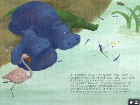 Una book app che parte dal libro di Alessandra Henke e dalle illustrazioni di Marta Dal Corso, pubblicato da Kite Edizioni nel 2012. La storia è divertente, sia per i personaggi che per le situazioni rappresentate: un grasso e pigro ippopotamo si innamora della danza dopo che ha assitito allo spettacolo delle libellule che abitano nello stagno. Inutile dire che molto lavoro e fatica lo aspettano se davvero vuole diventare un ballerino… I messaggi veicolati dalla storia di Osvaldo sono indiscutibilmente positivi: con l’impegno e l’aiuto degli amici si può tutto, anche l’inimmaginabile, come veder danzare un goffo ippopotamo!
