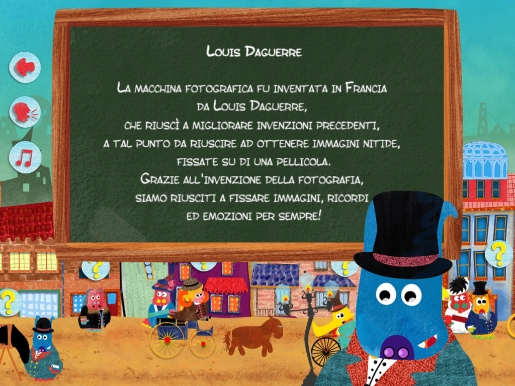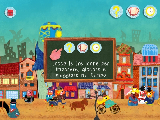 Un urbano paesaggio naif su cui si ripercuotono gli effetti del tempo e del progresso in tre epoche diverse. Questo lo scenario e il pretesto narrativo per raccontare ai bambini le grandi invenzioni che hanno cambiato la storia, ma anche la vita quotidiana e il volto delle nostre città. Dai mulini ad acqua alla fotografia, dall’elettricità al telefono, dalle macchine agli aeroplani, inventori e invenzioni sono i contenuti di questa app colorata e dall’intento apertamente educativo