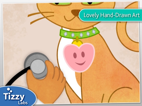 Auscultare il battito cardiaco del pappagallo, pulire i denti del gatto, provare la pressione al cane. Sono alcune delle attività di questa app, che permette ai bambini di giocare al dottore con gli animali. Destinata alla fascia di età prescolare, Tizzy Veterinarian consente di scegliere tra 6 piccoli pazienti (2 gatti, 2 pappagalli e 2 cani) e, dopo aver fatto una radiografia, di effettuare un check up ed individuare i problemi su cui intervenire.