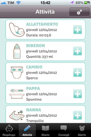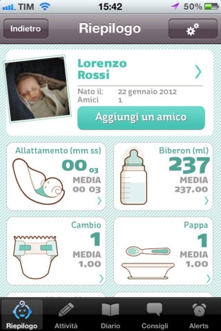 • l’allattamento, sia naturale sia artificiale. Se state cercando un’app specifica per l’allattamento, forse HiBaby non vi soddisferà del tutto, poiché non tiene traccia degli orari delle poppate, ma solo delle quantità delle somministrazioni per seno o biberon. La soluzione comunque c’è: basta appuntarsi l’ora nello spazio note;