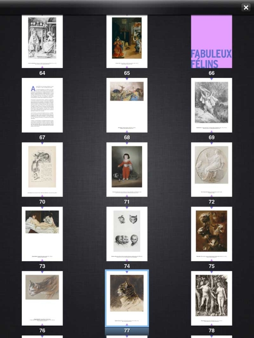 Giustamente, la descrizione dell’app vanta l’altissima risoluzione delle immagini, che è uno dei punti di forza della pubblicazione: toccando ogni riproduzione la si può ammirare a tutto schermo e zoomare fino ai piccoli dettagli. Una funzione molto utile soprattutto se si vogliono osservare i felini, che spesso occupano uno spazio secondario, ai margini dell’opera, come il gattino nero con il pelo irto, che fissa lo spettatore ai piedi dell’Olympia di Manet. Ma ci sono anche manufatti o opere in cui l’animale è protagonista, come nel caso delle piccole mummie di gatto egiziane o della una splendida, ieratica testa di felino di un acquerello di Delacroix. Tra le bellissime riproduzioni incluse – uno dei modi più intelligenti per sfruttare la risoluzione Retina dello schermo dell’iPad – figurano capolavori di Dürer, Renoir, Brassaï, Tiziano, Hiroshige, con una forte presenza di autori francesi dell’Otto e Novecento, comprensibilmente dettata dal carattere delle collezioni dei musei nazionali francesi, anche se non mancano dipinti da istituzioni straniere come la National Gallery di Londra, del Metropolitan di New York o del Museo archeologico nazionale di Napoli.
