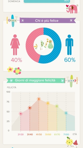 La funzione più curiosa e interessante dell’app è però quella delle statistiche, che permette di visualizzare una sorta di mappa della felicità dei genitori italiani. Le statistiche mi dicono infatti dove sono i luoghi con i maggiori check in e quindi dove le persone sono felici in quel momento. Ma anche quali sono i giorni della settimana più felici e quali gli orari. Qual è la regione in cui ci sono più check in della felicità? Sono più felici le mamme o i papà? Si è più felici al mattino, quando si ha una nuova giornata davanti e il piccolo strepita perché non vuole andare all’asilo oppure alla sera quando strepita perché non vuole andare a letto? Quando si popolerà di check in la mappa darà un’immagine incoraggiante, quella di un’Italia positiva, capace di andare avanti e trovare la serenità nei piccoli momenti di tutti i giorni. Perché, come diceva Trilussa, “Tutto sommato, la felicità è una piccola cosa”, come tuo figlio che per sapere quando andrai a prenderlo ti chiede “mamma, ma tu arrivi prima o dopo la merenda?” e ti fa scoprire un modo nuovo di misurare il tempo.