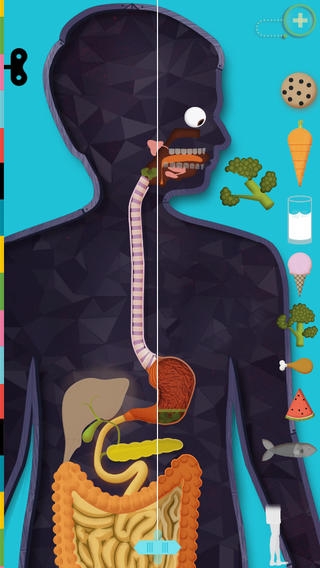 Il corpo umano è una macchina meravigliosa, che incuriosisce naturalmente i bambini. Scoprire “come siamo fatti” e come funzioniamo è la premessa da cui parte quest’applicazione, che permette di esplorare i sistemi scheletrico, muscolare, nervoso, circolatorio, respiratorio e digerente. Ossa, cervello, cellule e vasi sanguigni sono resi con una grafica semplificata e schematica, ma efficace ed elegante che simula per esempio l’arrivo del cibo nello stomaco, il cuore che si contrae, con il sangue che entra ed esce dai ventricoli, l’aria che gonfia i polmoni. Ogni organo o tessuto offre una vista dall’esterno e dall’interno, semplicemente passando un dito sullo schermo e dà in molti casi la possibilità di avere un’immagine ravvicinata di dettaglio, per esempio sugli alveoli o sull’interno delle ossa. Si può anche scoprire, trascinando singoli oggetti dal menù al modello del corpo, che effetto fa un determinato cibo sui denti, una corsa sul cuore, uno spillo sul sistema nervoso.