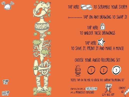 In questo magico albo illustrato, quindi, se si torna indietro non si trovano mai le stesse combinazioni e ci si può divertire ad andare su e giù facendole cambiare continuamente. Ci si può quindi perdere in una storia infinita, oppure bloccare e salvare quelle che preferiamo, registrando una frase in corrispondenza di ogni disegno. Il meccanismo di blocco e registrazione non è di comprensione immediata e potrebbe forse essere supportato da un tutorial più dettagliato – per esempio, anche se bloccati, i disegni cambiano se usate la funzione “scramble” o “swap” accessibili dal pulsante “Curious Hat” e ogni frase che registrate è associata al singolo disegno, quindi verrà meno se modificate quell’illustrazione.