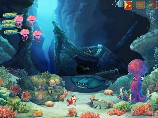 Ognuna delle 3 scene consente di toccare i pesci e le altre creature per attivare una serie di mini animazioni. Disattivando le animazioni attraverso il pulsante di audio in alto a destra, si ascolterà invece ad ogni “tap” una voce che racconta le caratteristiche del singolo animale e le sue abitudine di vita.