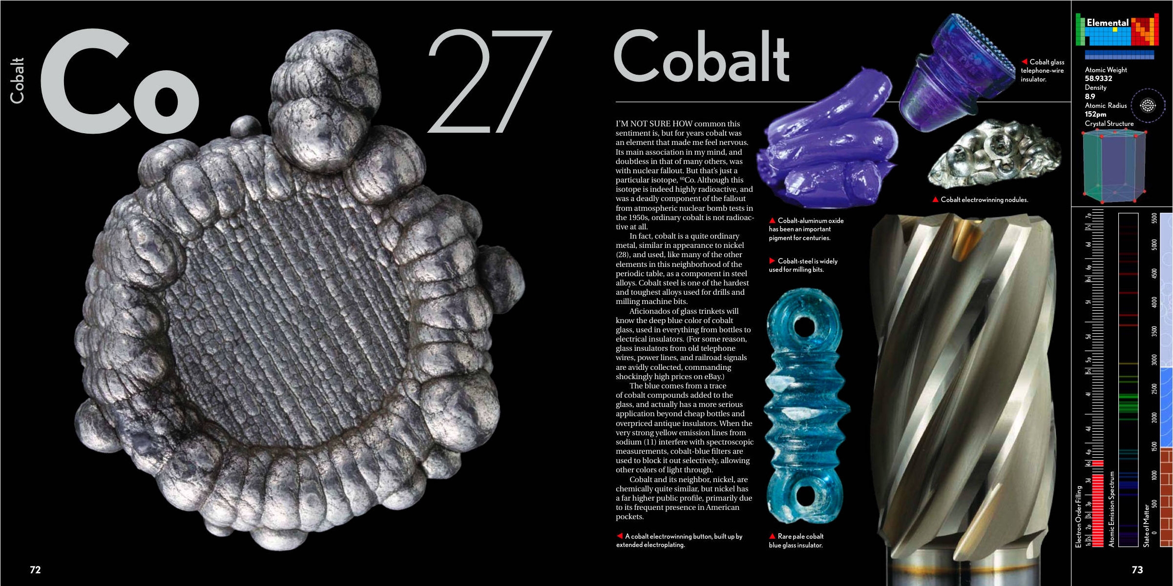 La parte più spettacolare di The Elements è però quella a cui si accede da ogni riquadro tramite il pulsante in basso a destra, che porta a una descrizione dell’elemento chimico, ricca di riferimenti storici, curiosità ed esempi pratici, accompagnata dall’immagine di una serie di oggetti realizzati con quel materiale. È possibile così studiare l’oro osservando una pepita, il rame attraverso un cavo elettrico o una statuetta cinese, il tungsteno attraverso il filamento di una lampadina, il cadmio con il disco di un freno, l’argento con una moneta coniata da Alessandro Magno.