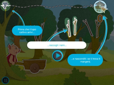 Nel corso della lettura, le uniche interazioni proposte al bambino sono quelle che prevedono l’utilizzo della “polvere magica”, in grado di svelare le immagini nascoste nelle pagine. Con l’ultimo aggiornamento l’app si è arricchita anche di un gioco (si raggiunge dal pulsante Bonus) di coordinamento mano-occhio: il bambino deve aiutare il secondo porcellino a raccogliere quanti più rami per costruire la sua casa prima che arrivi il lupo! Testata su iPhone, non presenta tutte le opzioni di gioco e funzionalità di supporto alla lettura che offre su iPad.