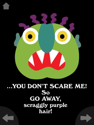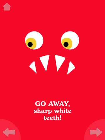 L’albo best seller di Ed Emberley diventa una riuscita applicazione digitale, raccontata in modo convincente dalla voce dell’autore stesso. Il libro ha insegnato a migliaia di bambini ad affrontare le proprie paure trasformando il terrificante in ridicolo, attraverso l’immagine di un mostro orribile che perde mano a mano i suoi attributi terrificanti. “Non mi fai paura! Vattene grande bocca rossa!”: toccando lo schermo il piccolo lettore fa scomparire gli occhi gialli, i capelli viola, le terribili zanne appuntite, la faccia gialla, finché al mostro, di cui non rimane più nulla, viene intimato di “Non tornare più! Finché non te lo dico io!”. Go away Big Green Monster è un classico che trasferito su tablet non perde il proprio fascino. Anzi, ci guadagna. Suoni divertenti e buffi effetti dinamici amplificano infatti la dimensione del ridicolo su cui si basa il semplice, ma efficacissimo meccanismo narrativo. Capace di trasformare in cuor di leone anche il più timoroso dei bambini.
