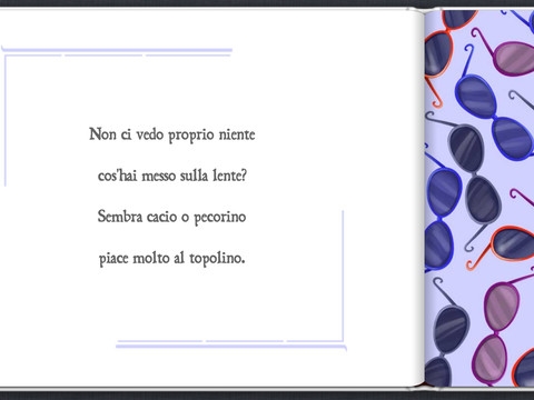Le illustrazioni di Michela Ameli (Glifodesign) e Francesca Gallina costruiscono scenari che ricordano pattern di tessuti, densi di oggetti dai colori vivaci, in cui si mimetizzano in modo inventivo ed efficace gli animali più diversi, dalla giraffa al dinosauro. Se riuscite a trovare dove si nasconde il protagonista – operazione talvolta non immediata nemmeno per un adulto – scoprirete con un touch un’animazione o una nuova scena, in cui il topolino mangia il formaggio, la giraffa si ritrova nella savana e il serpente esce dal cesto di un incantantore. Quelle decisamente più riuscite e stilisticamente più coerenti con il libro sono proprio le animazioni essenziali, che non interrompono il ritmo serrato delle filastrocche e hanno una grafica stilizzata congruente con le tavole.