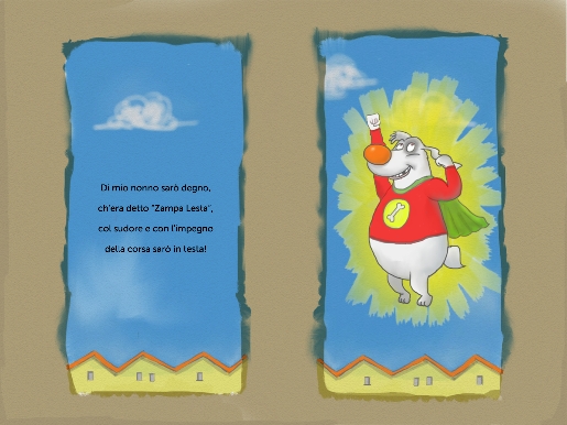 Raimondo nutre sogni di gloria, si vede già in testa alla corsa, lo vediamo indossare, al touch, il costume da super-dog e, al suono di un aereo che decolla, attraversa la tavola con sorriso da eroe invincibile. Grande ironia in questa tavola! Tra una cimiera che sbuffa e una talpa che sbuca qua e là, una salsiccia penzolante dovrebbe motivare i suoi allenamenti. Ma come contrastare un alano scattante, un prestante mastino e un levriero primatista? (questi concorrenti entrano nella tavola uno per volta associati ad un suono specifico e al fumetto con il nome).