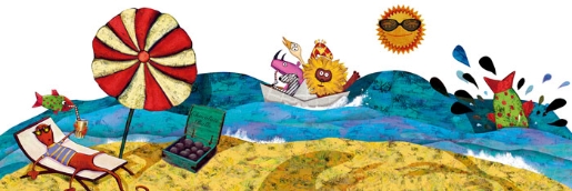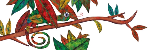 Più che pagine singole, dunque, una lunga striscia, su cui leggere i brevi blocchi di testo in rima (mai tradotti in italiano, peccato!) e in cui osservare i mille particolari e decori inventati dall’autrice. Un po’ naif e un po’ ispirata al collage, la tecnica illustrativa ci fa scivolare velocemente nella storia di Rita, che crede di essere prima un camaleonte e poi una tartaruga e che potrà scoprire la propria identità solo grazie all’aiuto di un gruppo di amici riccamente assortito.