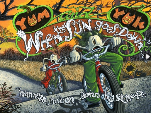 Due gli inquietanti protagonisti: Yum e Yuk, creature di fantasia spericolata, un solo occhio nel centro di quella cha ha tutta l’aria di essere una testa…braccia fini, pantaloni cadenti, bocca triviale, a bordo di una rombante…bicicletta.