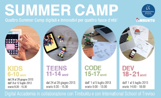 – Digital Summer Camp per kids e teens: due iniziative per giocare, sperimentare e crescere tramite le nuove tecnologie. In collaborazione con Timbuktu Lab e International School of Treviso