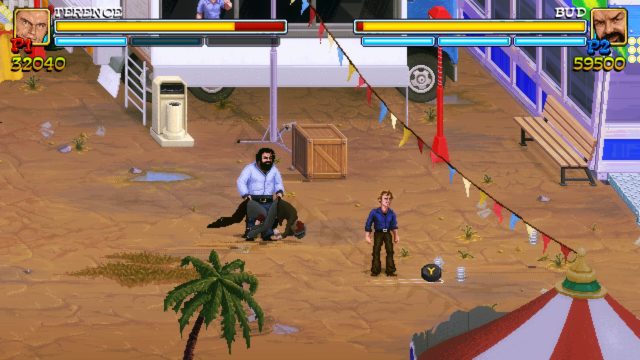 Bud Spencer sta spiegando la sua versione di “discussione”, con due nemici tramortiti presi per la cintura: Slaps and Beans è un vero picchiaduro!