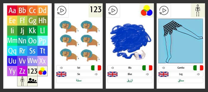 Nell’app, pensata per essere utilizzata sui telefoni cellulari e sui tablet, si trovano in tutto 189 tavole illustrate e interattive, divise in sezioni. La sezione “parole” è la più importante, costituisce l’ABC. Poi ci sono una parte dedicata ai numeri e una dedicata ai colori, molto uniforme grazie al lavoro di Silvia Provantini. La quarta sezione è quella che distingue le parti del corpo umano, e infine c’è la sezione utile a indicare le persone della famiglia. Un progetto di questo tipo tende all’infinito ovviamente, si potrebbero aggiungere molte e molte altre tavole. Non ci sono i verbi, per esempio, e andrebbero aggiunti!