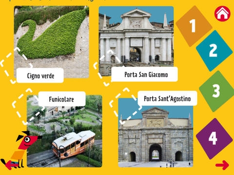 Protagonista dell’applicazione ZigZag, il cagnolino di Arlecchino – la maschera simbolo della città – che ha perso il suo padrone per le strade di Bergamo. Per ritrovarlo ha bisogno dell’aiuto dei bambini, che dovranno seguire 3 itinerari e risolvere indovinelli, guardandosi attorno per riconoscere torri, contare i serpenti, scattare foto dei monumenti e scoprire dove si nascondono i leoni.