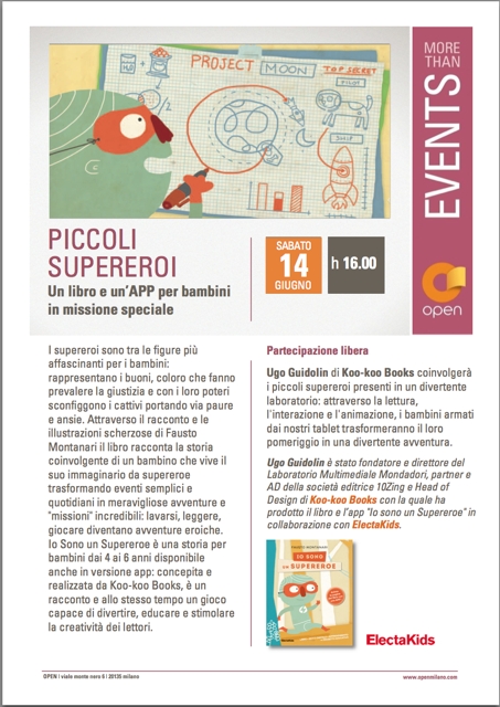Nel corso del primo incontro avrà luogo la presentazione di “Io sono un supereroe”, un libro e un’app in cui si narra l'”eroica” giornata di scoperte, avventure e missioni di un bambino. Il secondo sarà invece un laboratorio collettivo al quale parteciperanno i migliori editori digitali per bambini: Minibombo, Tapook, Mubo, Art Stories, Koo koo Books ed Elastico proporranno le loro app per accompagnare i bambini nelle vacanze estive.